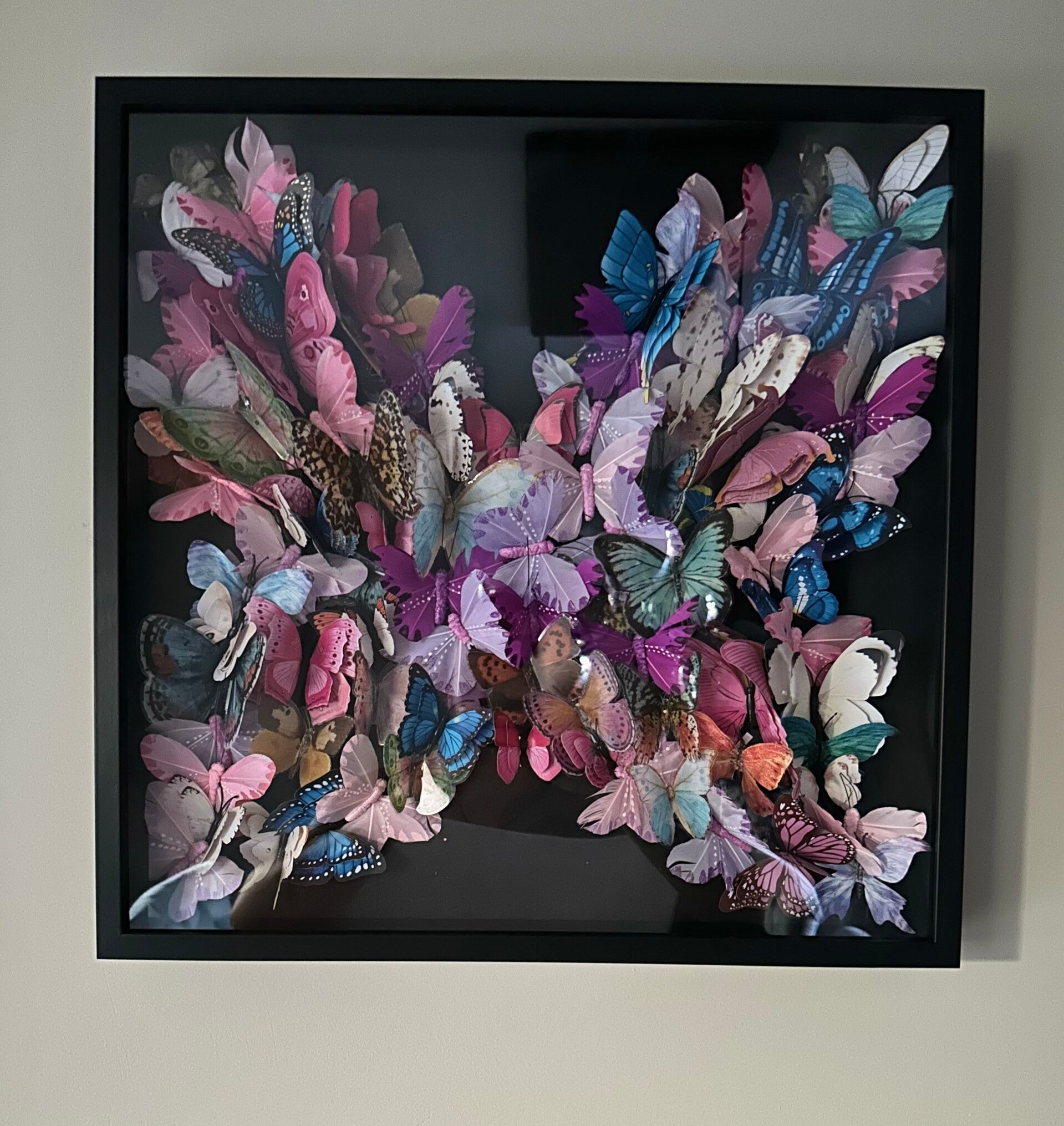 Het Yara 3D schilderij brengt de magie van vlinders rechtstreeks in je interieur. Met de hand vervaardigd en met oog voor detail opgebouwd, vormen tientallen kleurrijke vlinders samen een prachtig driedimensionaal kunstwerk. De levendige tinten van paars, blauw, roze en zacht pastel komen tot leven tegen de donkere achtergrond, waardoor een betoverend contrast ontstaat.