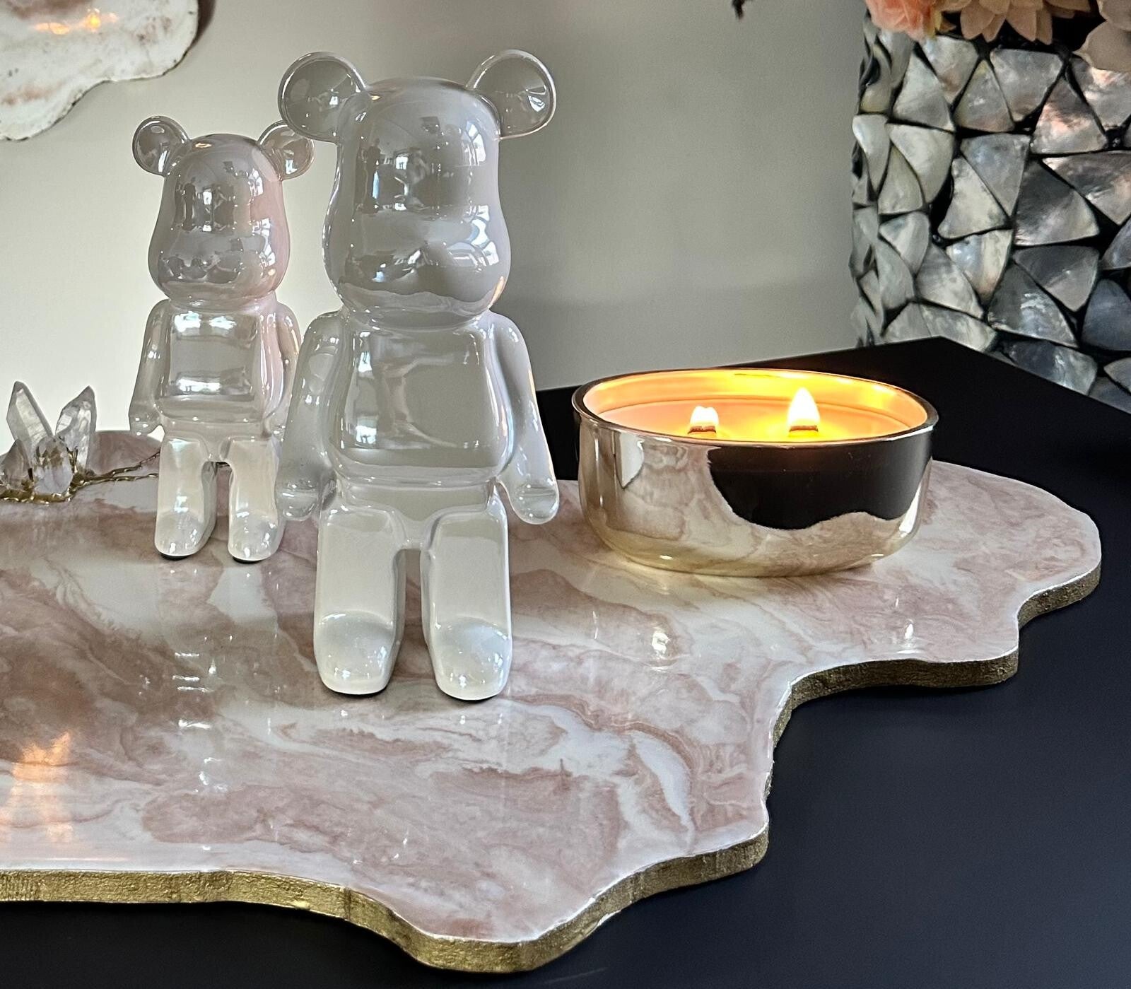 De twee glanzende beertjes hebben een moderne, minimalistische uitstraling en passen perfect op een dressoir, salontafel of kinderkamer. Hun zachte ivoortint en verfijnde afwerking zorgen voor een rustige, stijlvolle look.