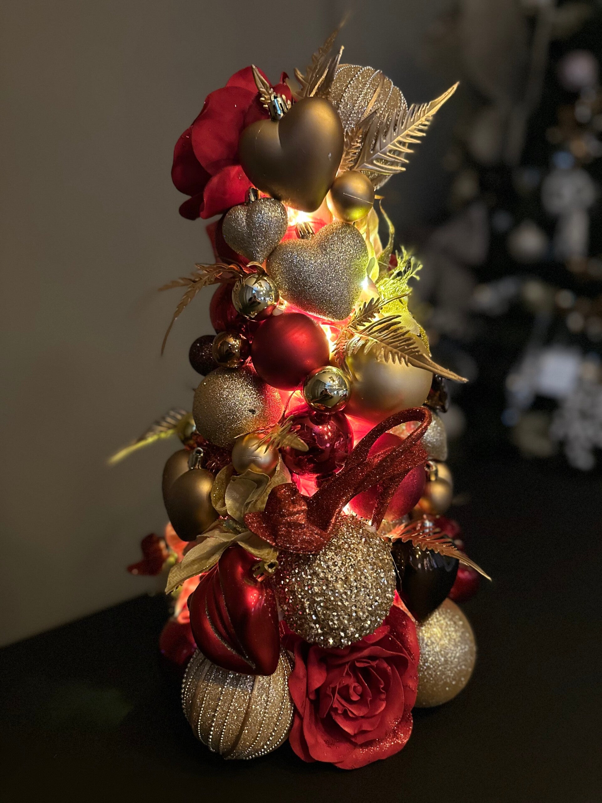 Creëer een exclusieve kerstsfeer met Kerstboom - Moulin Rouge, een handgemaakte design-kerstboom van 50 cm hoog, volledig opgebouwd uit glanzende kerstballen. Deze elegante kerstdecoratie is perfect voor wie houdt van stijl, luxe en verfijnde kerstversiering.